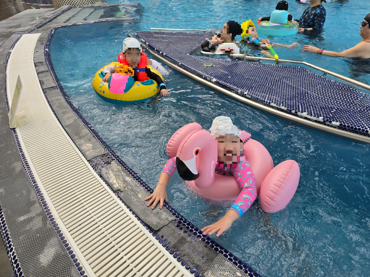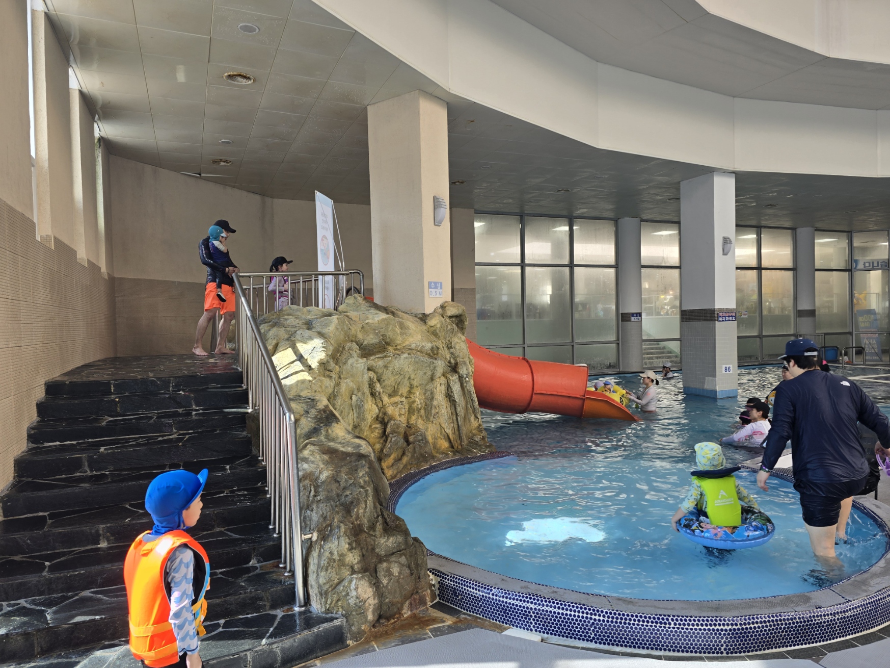 워터슬라이드도 있어서 아이들이 정말 신나게 놀더라구요. 40분마다 나오라고 하는 다른 수영장과 달리 마음껏 즐길 수 있어서 편안했어요.