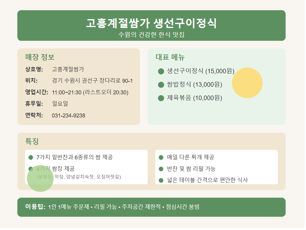 오늘 소개한 고흥계절쌈가 정말 강추합니다! 건강한 한끼, 푸짐한 상차림, 그리고 정성까지 모두 느낄 수 있는 곳이에요. 엄마표 집밥이 그리우신 분들 꼭 한번 가보세요! 특히 생선구이정식은 진짜 최고! 일하느라 지친 직장인들, 건강한 식사가 필요한 분들 모두에게 딱입니다. 다들 고흥계절쌈가 가보셨나요? 혹시 다른 메뉴도 드셔보셨다면 어떤 메뉴가 제일 맛있었는지 댓글로 알려주세요~ 저도 다음에 가면 참고할게용! 이상 수원 맛집 탐방 리포트 마치겠습니다 ㅎㅎ